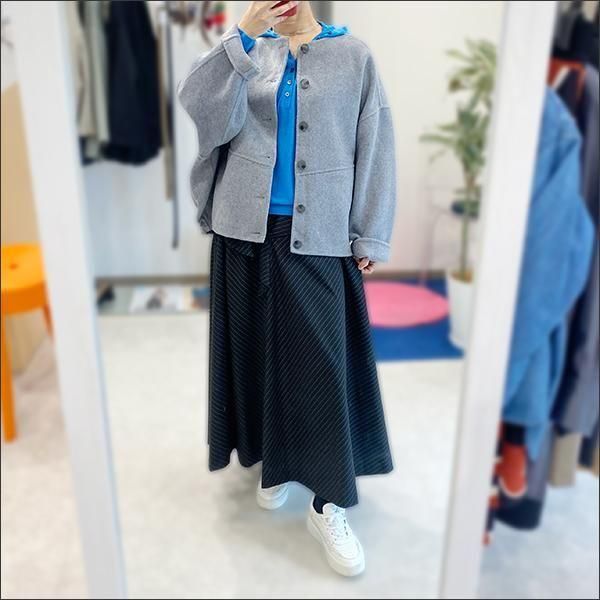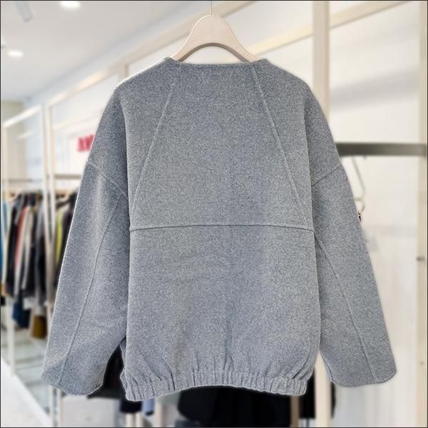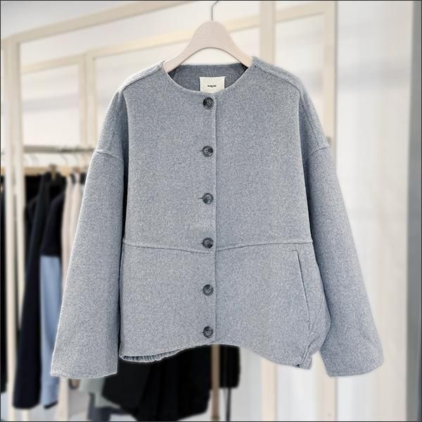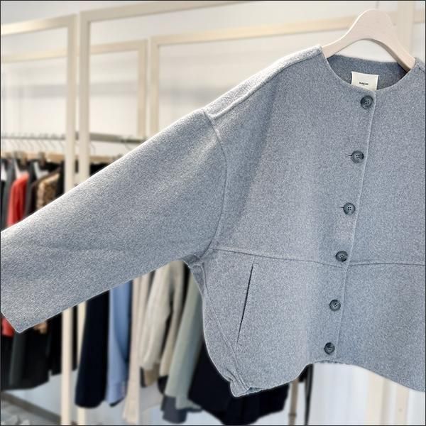 ノーカラーですっきりと見える衿まわり、丸みのあるシルエットで雰囲気あるデザイン。