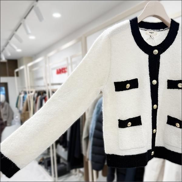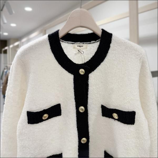 ゴールドボタンがアクセントになったバイカラーカーディガン。