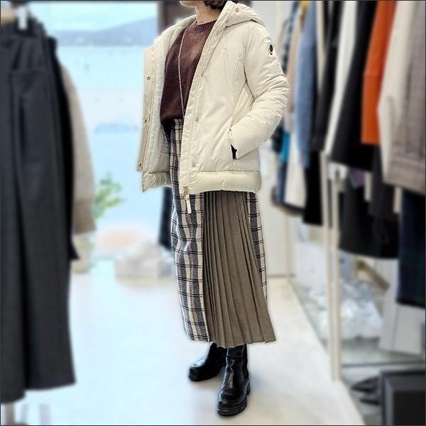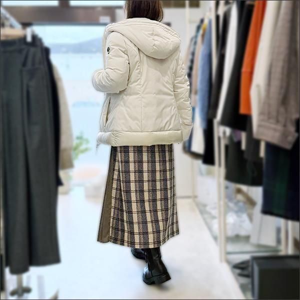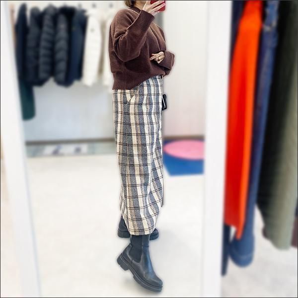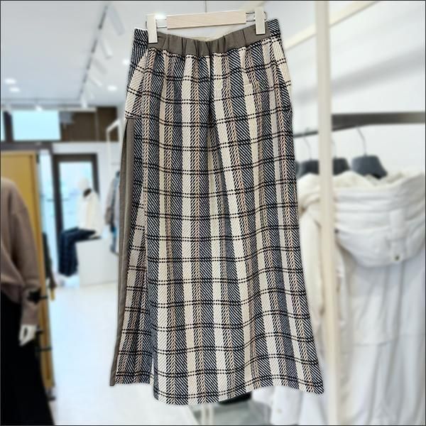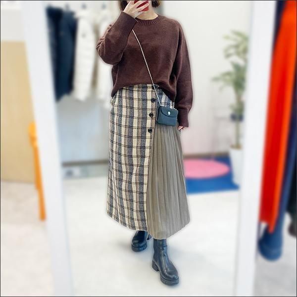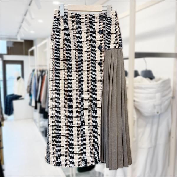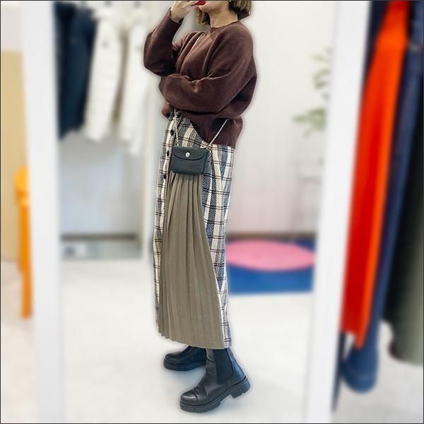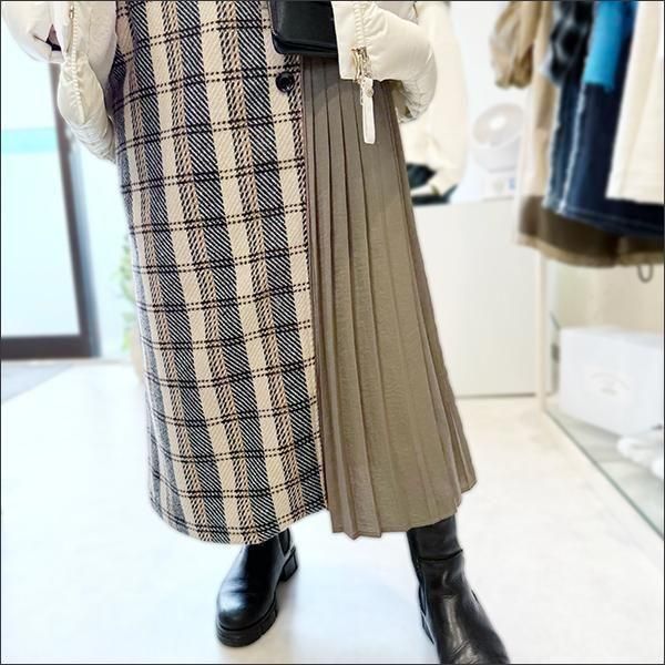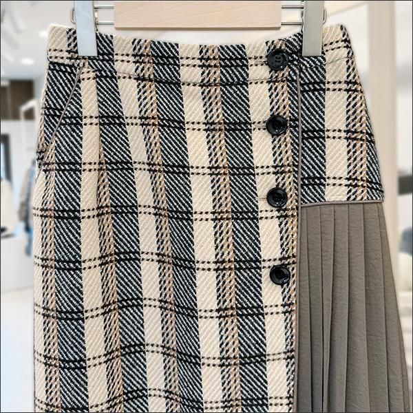 動くたびに揺れるプリーツとざっくり感があるチェック生地のコントラストが魅力のドッキングスカート。
