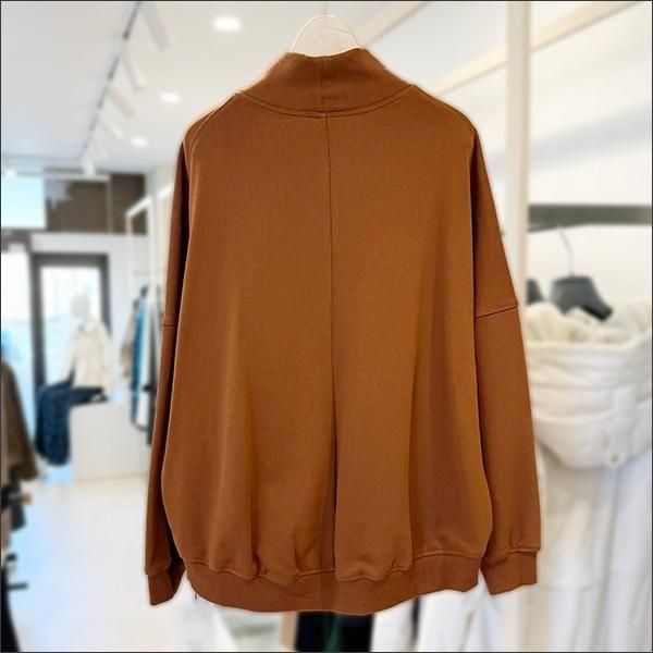 全体的にゆとりを持たせたシルエットは快適な着心地で、首元はゆとりを持たせたハイネックデザインなのでインナーにタートルニットやシャツなどをレイヤードして着用可能です。